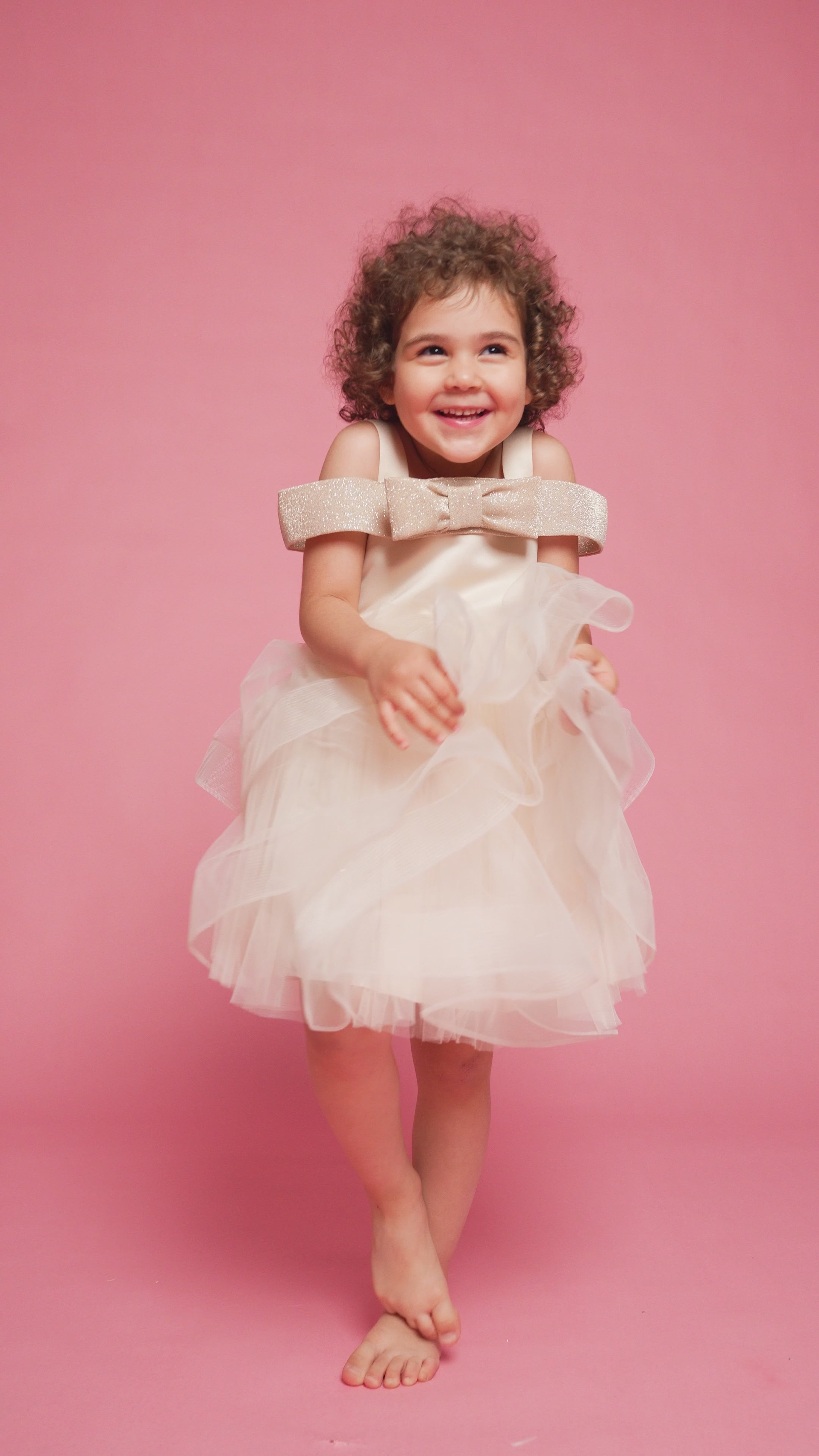 Nomea je spoj razigrane elegancije i diskretnog sjaja. Slojeviti til donosi lakoću i pokret, dok zlatna mašna u gornjem delu haljine daje savremeni couture pečat. Idealna za rođendane, svečanosti ili jednostavno posebne uspomene.